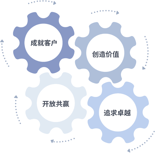 成就客户是一切决策的出发点,,,创造价值是衡量所有工作的标准,,,追求卓越是我们做事做人的态度,,,,开放共赢是我们的格局也是最终的结果。。价值观的齿轮环环相扣,,,推动着组织里的每个人不断向前。。。