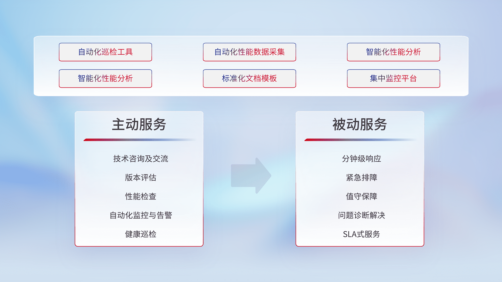 智能化工具和标准化文档,,,,保障服务质量,,,提供主动服务(包含技术咨询、、、、版本评估、、性能检查、、自动化监控与告警、、、、健康巡检)和被动服务包含(分钟级响应、、紧急排障、、、值守保障、、、问题诊断解决、、、SLA服务)。。。